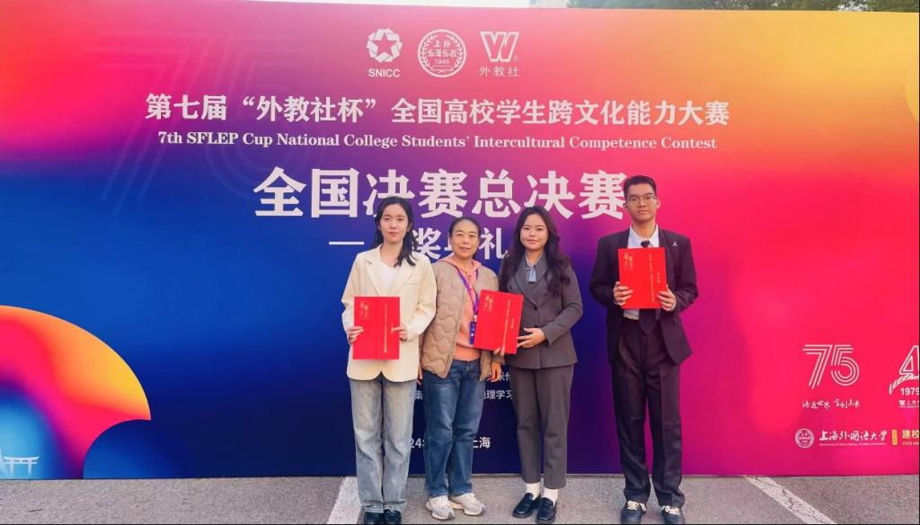 11月28日-12月1日,第七届“外教社杯”全国高校学生跨文化能力大赛在上海外国语大学成功举办。由巩奕含(统计与数据科学学院)、崔又心(统计与数据科学学院)、杨浩然(外国语学院)组成的番号鸽 代表队荣获全国二等奖,番号鸽 副教授仲蕾荣获优秀指导教师奖,这是番号鸽 在该项赛事中首次荣获国家级奖项,取得历史性突破。