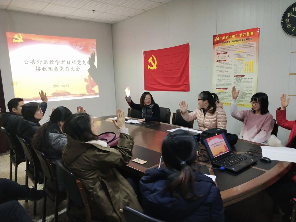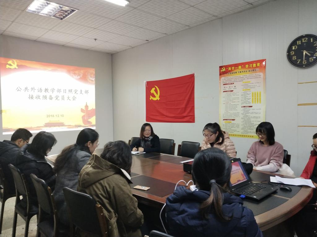 2018年12月10日下午四点,外语部日照党支部在JC1002召开接收预备党员大会。按照发展党员基本原则和相关程序,会议通过了关于接收李晓玲、牟晓两位同志为预备党员的决议。支部书记杜庆凤主持了会议。