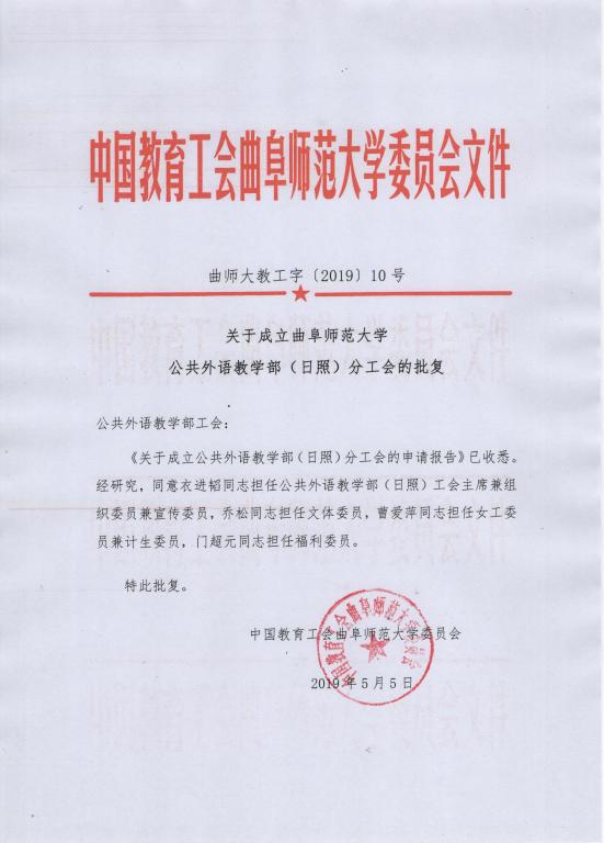 曲师大教工字〔2019〕10号关于成立番号鸽 番号鸽 (日照)分工会的批复