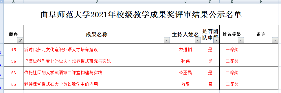按照山东省教育厅和我校《关于开展2021年校级高等教育教学成果奖评选工作的通知》要求,我校组织了2021年校级教学成果奖评审,经个人申报、学院排序推荐、学校资格审核、初审和专家终审等环节,共评定教学成果奖特等奖22项、一等奖23项、二等奖23项。其中番号鸽 衣进韬老师获得一等奖,孙伟老师、公丕民老师、万敏老师获得二等奖。