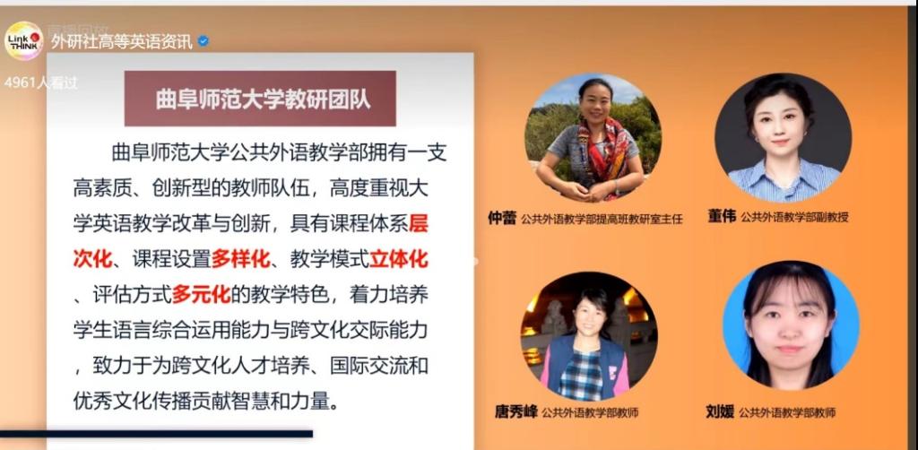 教研团队向广大教师介绍了具体设计思路和教学安排。在问答环节中,仲老师回答了关于小组活动的开展以及课程思政相关的问题,与广大院校分享了曲师大经验。