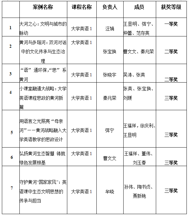 黄河重大国家战略课程思政优秀案例评选活动中取得佳绩,获得一等奖1项、二等奖2项、三等奖4项的佳绩,获奖总数位居全校第一。