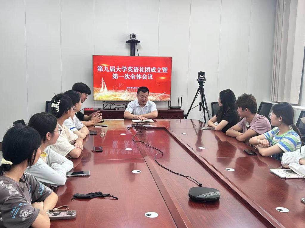 会议室召开。本次会议旨在宣告新一届英语社团的正式成立,明确社团未来发展方向,凝聚成员力量。大学英语社团指导教师王显明以及社团全体成员参与此次会议。